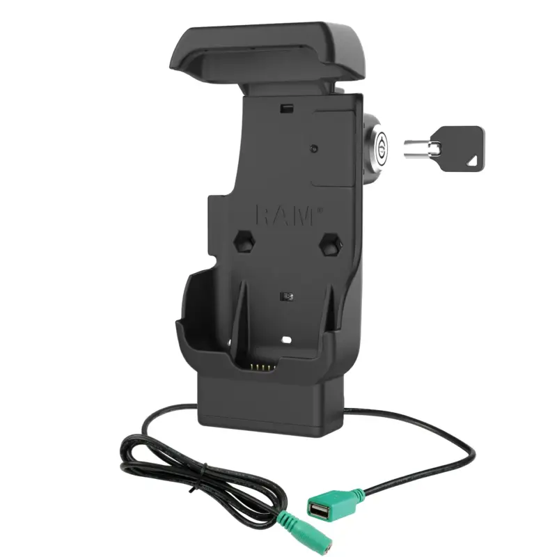The RAM® Locking Powered Dock + USB-A for Honeywell CT40/45/47 (RAM-HOL-HON12PDLU) is a spring-loaded, form-fit powered dock that allows workers to secure and charge their Honeywell device. Power to the device is delivered via a 1m long female 5.5mm DC barrel connector and supports a single peripheral device via USB-A female connector. This dock includes an integrated stylus holder that snaps your stylus into place while not in use and is designed to accommodate OEM accessories, such as the hand strap. The top cup of the holder features a cut-out, so workers can utilize the device’s scanner while docked. This holder comes with optional inserts to support devices with or without the protective rubber boot. The key lock provides theft deterrence and extra security for peace of mind in high-traffic areas. Complete your solution by adding a compatible RAM® two-hole AMPS pattern diamond base and double ball mount, allowing for a wide variety of mounting options (hardware included).
