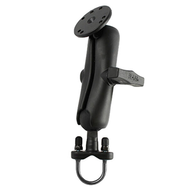 The RAM-101U-IP1 consists of a zinc coated u-bolt base, double socket arm and 2.5″ diameter round base that contains the universal AMPs hole pattern. Included in this package is hardware that will accommodate rails from 0.50″ to 1.25″ in diameter. The base includes black cover caps to be placed over the exposed ends of the u-bolt. The included composite rail adapter can narrow the rail to a minimum width of 0.5″. The mount is designed with a RAM 1.5″ diameter patented rubber ball and socket system that has adjustment points at both ends of the double socket arm; this allowing for almost infinite adjustment and perfect viewing angles.